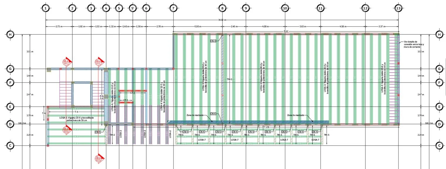 La combinación de concreto reforzado y elementos metálicos permitió optimizar secciones, mejorar la eficiencia estructural y mantener claridad constructiva en planos.