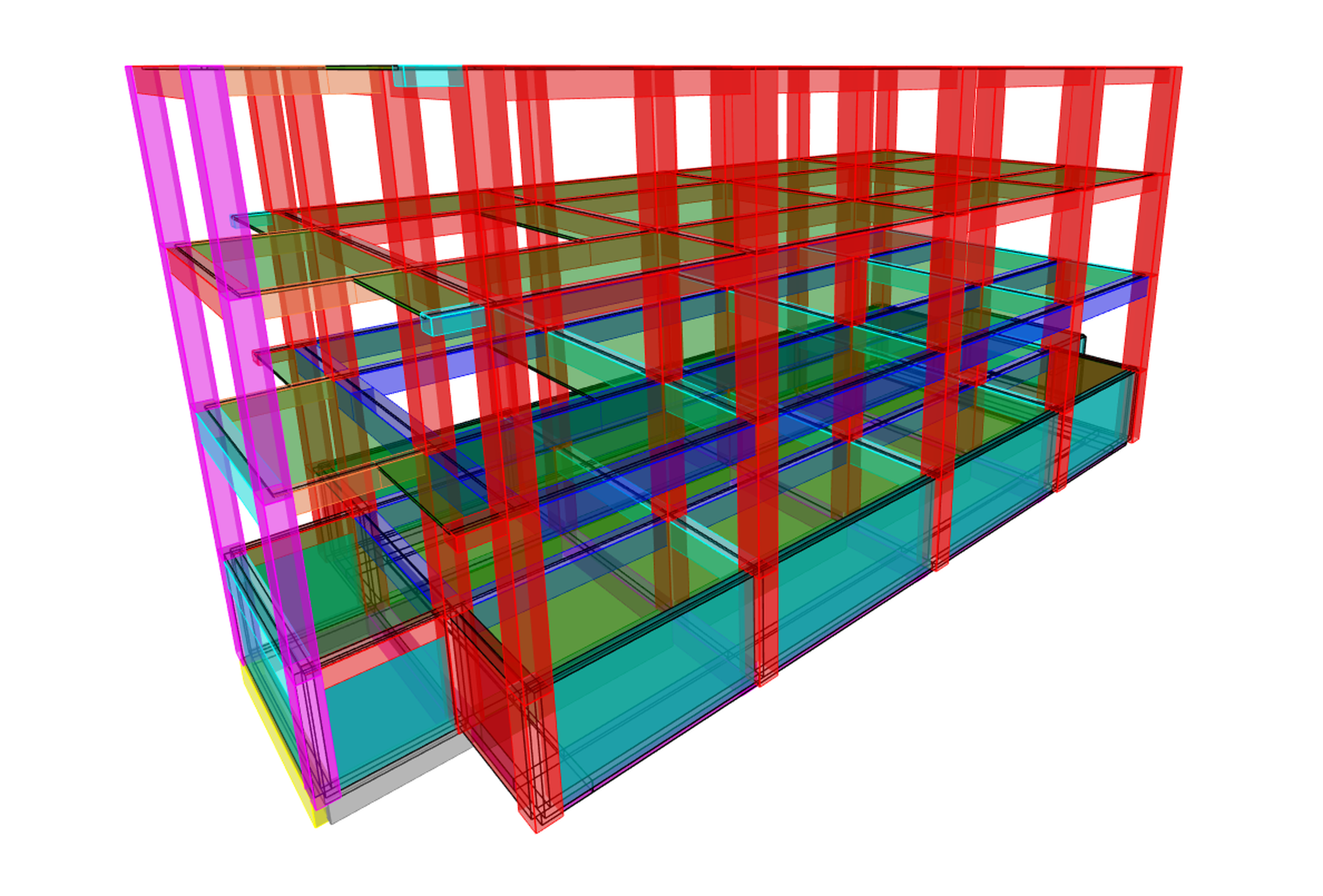 El sistema estructural fue resuelto mediante marcos de concreto reforzado, complementado con losa de vigueta y bovedilla en niveles superiores y muros de concreto reforzado en el sótano para contención y rigidez adicional.