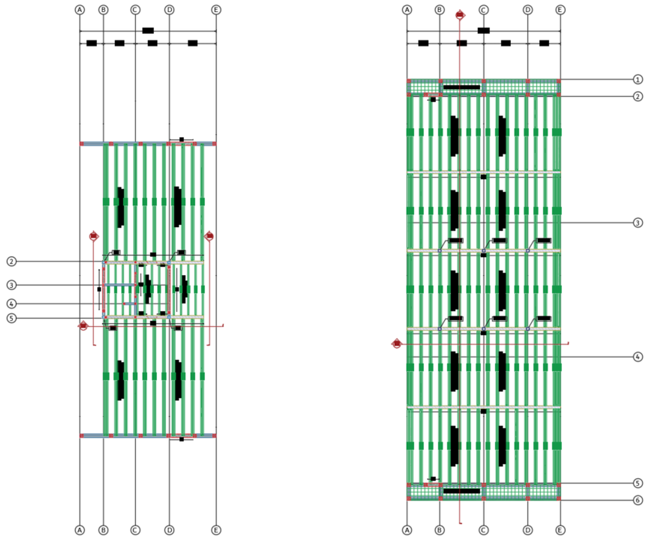 El sistema estructural central se resolvió mediante dos columnas HSS inclinadas que, en elevación, conforman una geometría triangular con una altura total aproximada de 16 m.
