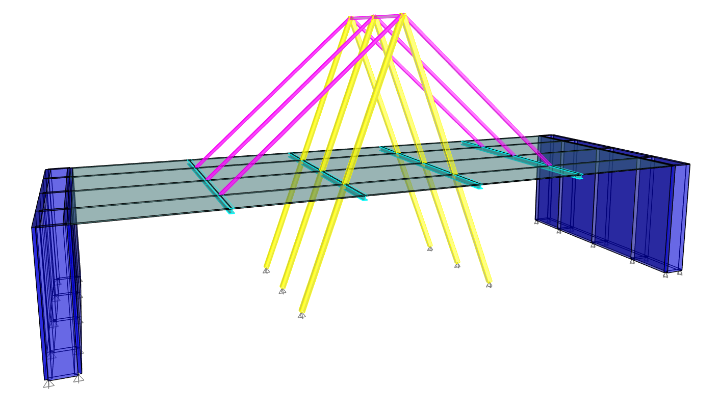 Las vigas metálicas centrales se apoyan directamente en estas columnas, mientras que las vigas laterales se estabilizan mediante tensores estructurales de acero (HSS), conectados al vértice del triángulo principal.